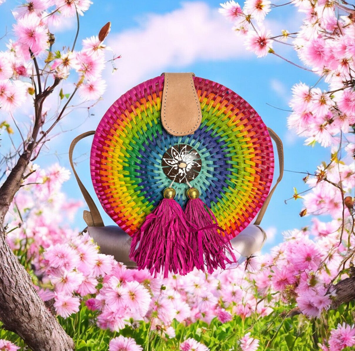 sac bandoulière rond en raphia